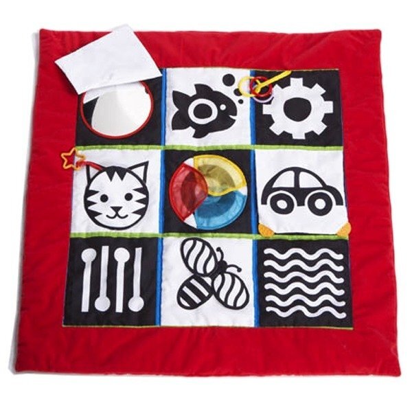 Mata wykonana jest z miękkiego materiału, Wyposażona w wiele elementów pobudzających zmysły oraz emocje malucha. W macie znajdują się: szeleszczące elementy, grzechotka, gryzak, lusterko, piszczałka. Kontrastowe barwy wpłyną na zmysł wzroku u dziecka. Mata może być rozłożona na podłodze.