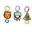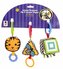 Trzy zawieszki za sprawą różnych kształtów oraz struktur będą rozwijać zmysły dziecka. Żywe, kontrastowe kolory wpłyną na rozwój wzroku. Zabawki wyposażone są w lusterko, gryzak, elementy szeleszczące, wstążki, klapy, piszczałkę oraz pierścień uruchamiający wibrację po pociągnięciu.