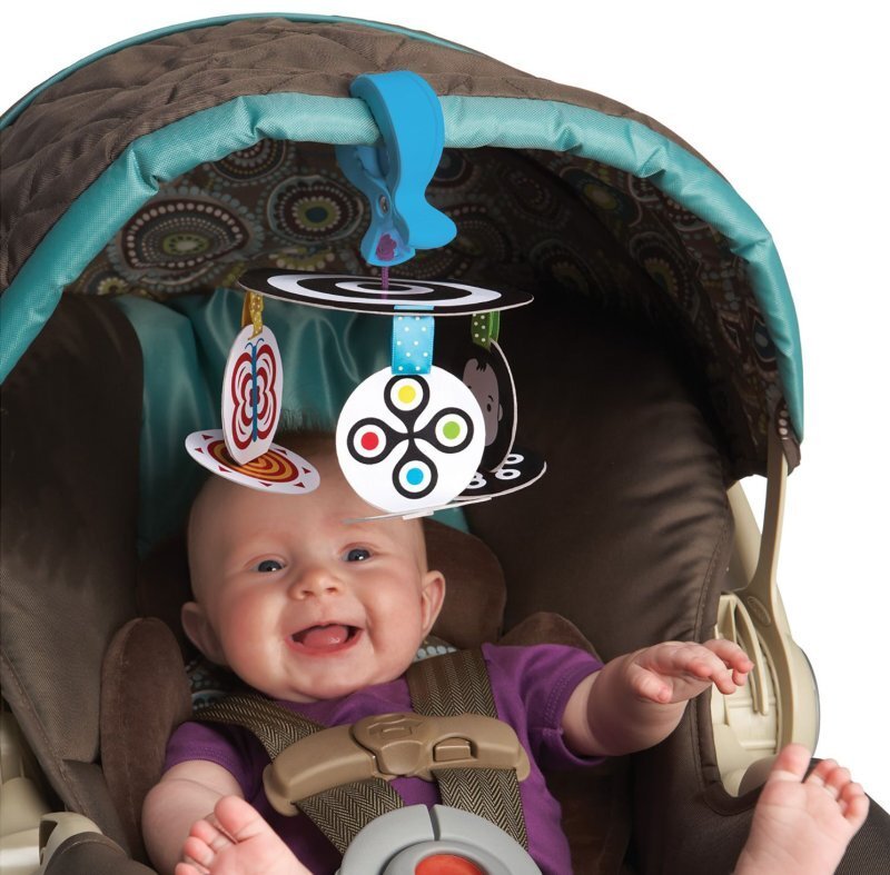 Karuzela do wózka dzięki plastikowemu uchwytowi może zostać zaczepiona niemalże do każdego rodzaju wózka/ fotelika. Wykonana jest z tworzyw sztucznych. Intensywne jak i kontrastowe kolory elementów pobudzą zmysły niemowlaka.