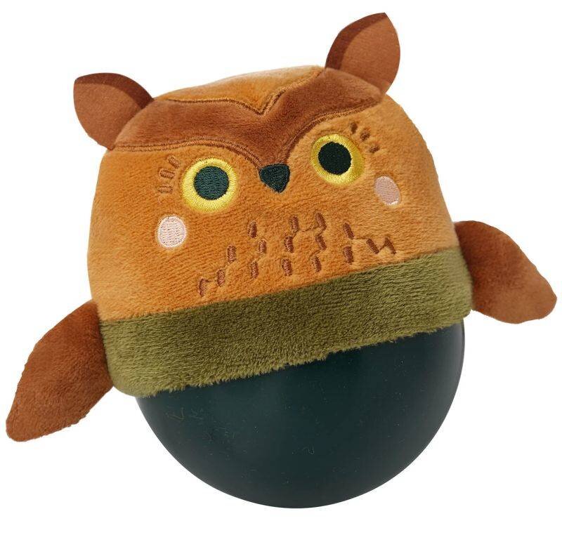 Chwieje się, kiwa, a po podrzuceniu delikatnie podskakuje! Sowa ma jedyną w swoim rodzaju budowę z wyważoną, miękką silikonową podstawą, które zawsze po zachwianiu się zabawki przywraca ją do pozycji pionowej. Ta silikonowa konstrukcja nie przypomina żadnej innej chwiejącej się zabawki na rynku. Górna część małego misia ma pluszowy materiał z wyhaftowanymi rysami twarzy i dzwonkiem wewnątrz dla dodatkowej przyjemności. Zabawka pozytywnie wpływa na rozwój motoryczny oraz myślenia przyczynowo-skutkowego.