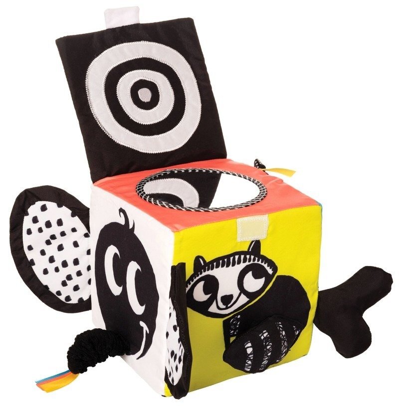 Sześcian pokryty z każdej strony ciekawymi i zróżnicowanymi detalami stymulującymi zmysły maluchów oraz rozwijający ich koordynację, motorykę i wyobraźnię. Miękka edukacyjna kostka Zoo zabawa Manhattan Toy posiada: piszczałkę, gryzak, grzechotkę, elastyczną trąbę słonia, inne wystające elementy należące do pozostałych postaci, zamykane na rzep drzwiczki za którymi znajduje się lusterko, szeleszczący papier, kolorowe wstążki.