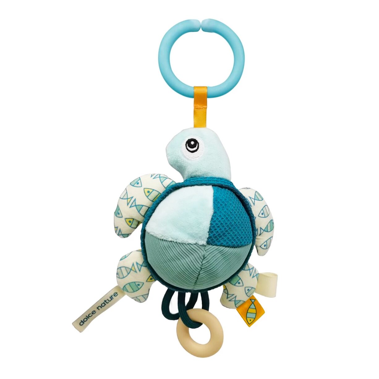 Závesná senzorická hračka so zrkadielkom Korytnačka bude dokonalým spoločníkom pre vaše bábätko, či ste doma alebo na cestách. Je ideálna na uchytenie na kočík alebo postieľku, s množstvom textúr a štítkov pre rozvoj hmatu a s hryzátkom pre posilnenie ďasien bábätka a neskôr aj pri prerezávaní zúbkov. Zrkadielko na brušku korytnačky zaujme bábätko a bude rovzíjať zmysel zraku. Vhodná od narodenia.