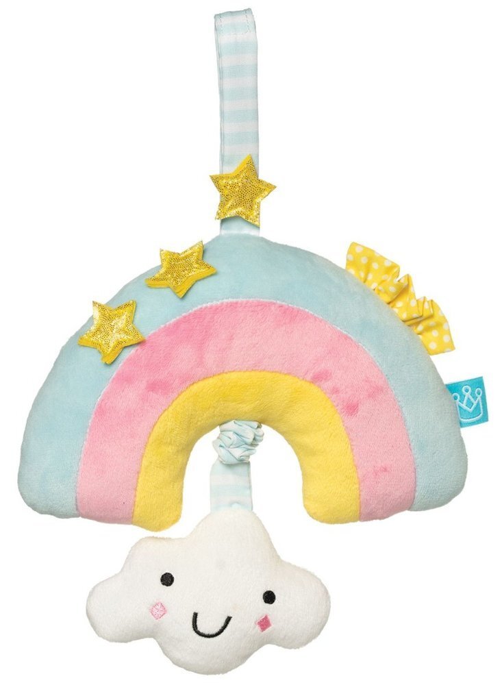 Ściągnij uśmiechniętą chmurkę z tęczy poprzez pociągnięcie jej w dół, aby usłyszeć „Fur Elise”. Gdy wybrzmi melodia chmurka ponownie, powoli przesunie się w górę. Zamocuj muzyczną chmurkę z Manhattan Toy za pomocą pętelki z tkaniny na nosidle lub wózku i wspieraj maluszka w procesie uczenia się przyczyny i skutku.