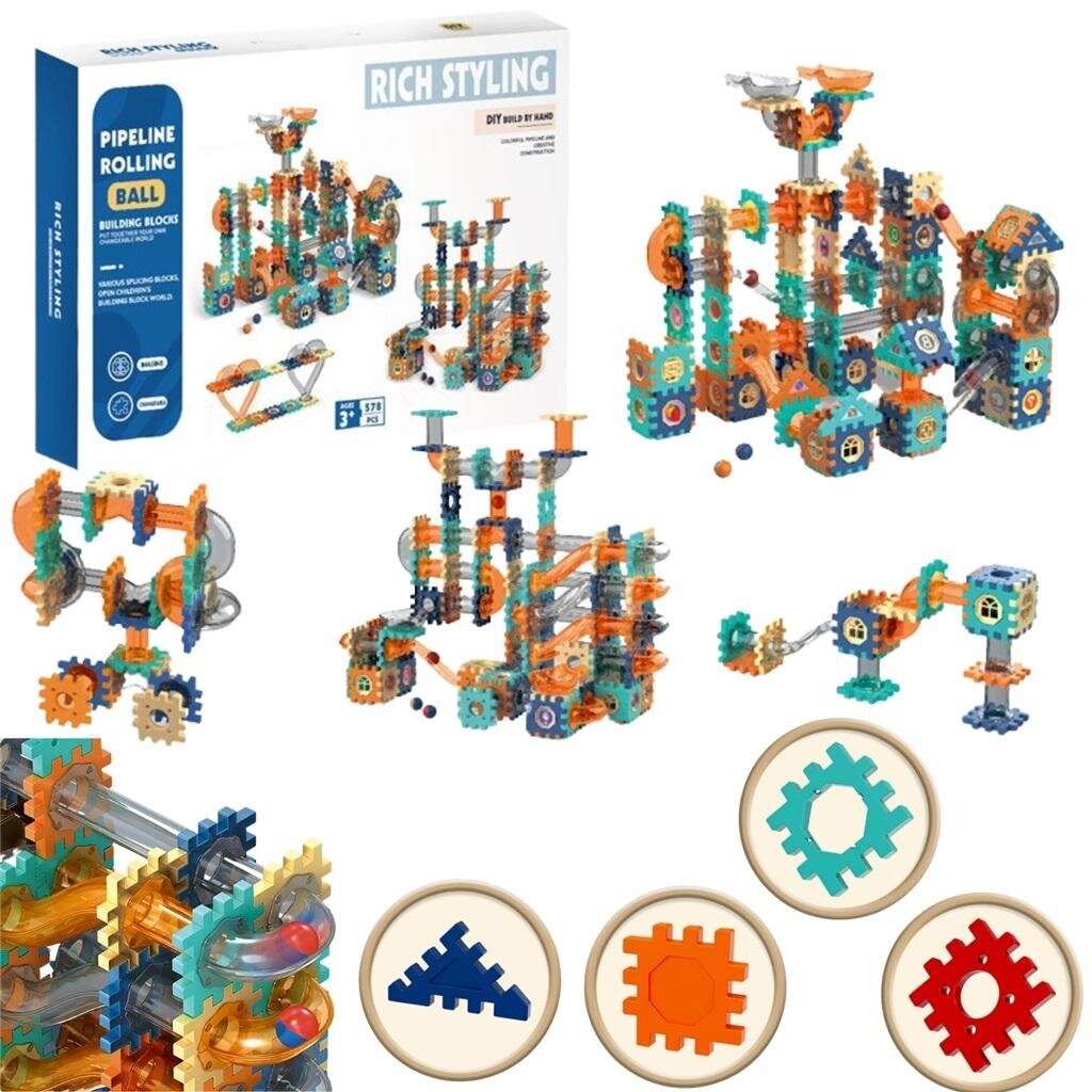 Zestaw składa się z różnokolorowych klocków, które można łączyć i tworzyć różnorodne konstrukcje. Dzięki połączeniom, klocki trzymają się ze sobą mocno i stabilnie, dając możliwość budowania zarówno prostych struktur, jak i bardziej zaawansowanych konstrukcji. Tor można układać w różne kształty i trasy, co dodatkowo rozwija wyobraźnię i zdolności konstrukcyjne dziecka.