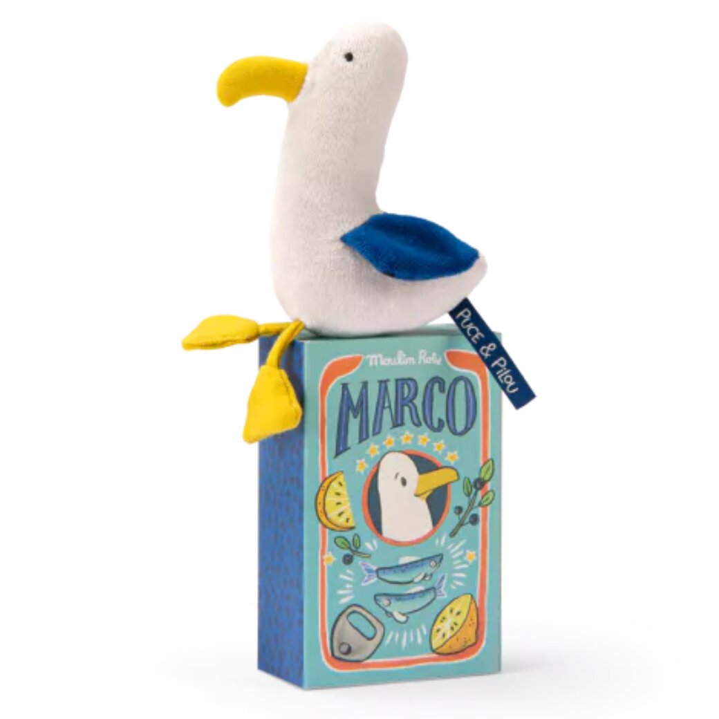 Marco, roztomilý racek, který cinká! Toto chrastítko je snadno uchopitelné, měkké na dotek a ideální na nošení všude s sebou!