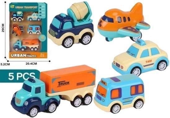 Odkryj fascynujący świat miejskiego transportu z tym wspaniałym zestawem 5 różnorodnych pojazdów! W pudełku czekają na Twoje dziecko: Samolot: Gotowy do podbicia przestworzy w żywych, pomarańczowo-turkusowych barwach. Taksówka: Klasyczny żółto-niebieski pojazd, który zawiezie małych pasażerów gdziekolwiek sobie wymarzą. Autobus: Niebiesko-fioletowy autobus miejski, idealny do przewożenia figurek i pluszaków. Cysterna: Turkusowo-kremowa ciężarówka z pomarańczową cysterną, gotowa do transportu płynów. Ciężarówka z naczepą: Długi pojazd w turkusowo-pomarańczowych kolorach, gotowy do transportu towarów. Każdy z pojazdów charakteryzuje się żywą kolorystyką i przyjaznym designem, idealnym dla małych rączek. Zabawa tym zestawem nie tylko dostarczy mnóstwo radości, ale także pobudzi kreatywność i wyobraźnię dziecka, zachęcając do odgrywania różnych scenariuszy związanych z życiem miasta. To doskonały prezent dla każdego malucha zainteresowanego motoryzacją!