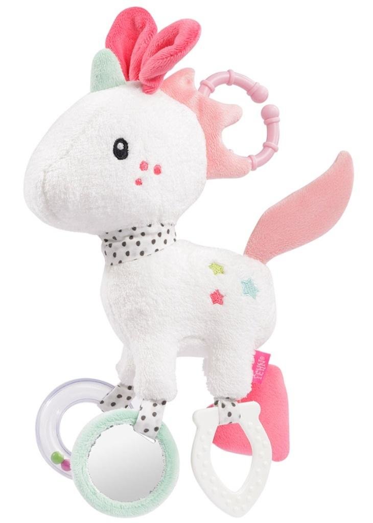 Zawieszka, maskotka edukacyjna, Jednorożec, z kolekcji: Aiko i Yuki. Słodki Jednorożec, to prawdziwa uczta dla Twojego maluszka! Serduszko, bezpieczne lusterko, mały gryzak, który przyniesie ulgę na etapie ząbkowania oraz grzechotka z tęczowymi perełkami, na pewno zainteresuje Twojego maluszka. Zawieszkę za pomocą praktycznego klipsa, można zamontować w dowolnym miejscu. W dolnej części wita nas aksamitne w dotyku, serduszko, które po naciśnięciu delikatnie popiskuje. Różne wzory, kontrastujące kolory i zróżnicowane powierzchnie zachęcają do odkrywania, chwytania i ściskania, co rozwija zdolności poznawcze. W okrągłym bezpiecznym lusterku Twoje dziecko może się przeglądać. Z zachowaniem wielkiej dbałości o szczegóły, zabawka, oferuje wszystko, co sprawia, że dziecięce serduszka biją szybciej. Pomaga zrozumieć świat, w ciągu dnia i wieczorami przed snem. Wyposażona jest w miłe w dotyku zabawki: bezpieczne lusterko, grzechotkę - tęczowe perełki, serduszko z piszczałką i ding dong wydający delikatny dźwięk oraz gryzak. Materiały o różnych fakturach stymulują dotyk. Rozwija zmysły i sprawność ruchową. Świetna zabawa na spacerze i w podróży. Zawiera klips do zawieszenia na łóżeczku, wózku, nosidełku itp. Można prać. Wszystkie zabawki niemieckiej marki FEHN są bezpieczne dla dzieci od 0 lat. Wykonane są z najlepszej jakości materiałów. Spełniają normy EN71, CE, badane w instytutach Stiftung Warentest lub kotest.