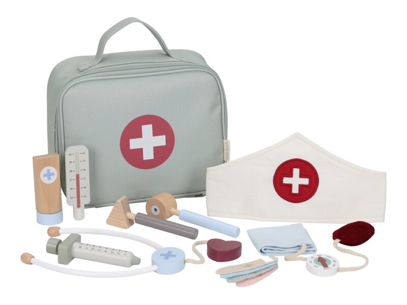 Paní doktorko, pane doktore - mohl/a byste se na mě podívat? S touto krásnou dřevěnou doktorskou sadou bude vaše dítě připravené postarat se o každého pacienta. Textilní lékařská taška ukrývá veškeré základní vybavení: teploměr, injekci, obvazy, stetoskop, tlakoměr a dokonce i doktorskou čepici.