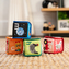 - Smyslové podněty - každá kostka obsahuje různé zvuky (chvění, chrastítko), textury a zářivé barvy ke stimulaci zraku, sluchu a hmatu