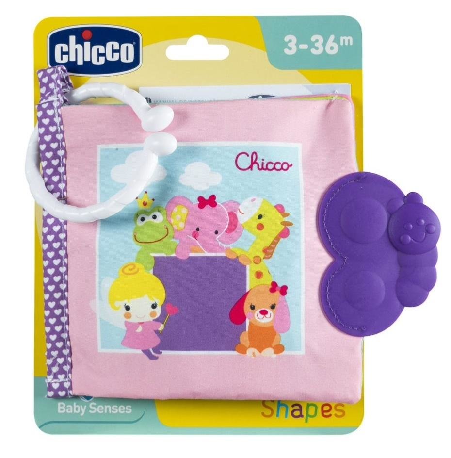 Książeczka Fantazyjne kształty z miękkiej tkaniny, która w dotyku wyraźnie i przyjemnie szeleści stymulując zmysł słuchu dziecka. Szelest wywoływany jest wskutek dotykania tekstylnych stronic książeczki, dzięki czemu dziecko uzmysławia sobie zasadę przyczyny i skutku. Strony książeczki wypełniają wielobarwne, z intensywnie nasyconymi kolorami obrazki tematyczne, których bohaterami są różne zwierzęta. Książeczka osadzona jest na niewielkiej, plastikowej obręczy, również żłobionej. Niewielki rozmiar i nierówna faktura ułatwia niewielkiej dziecięcej rączce pewny uchwyt. Uchwyt może także posłużyć do przyczepienia zabawki do pałąka wózka. Plastikowy, fioletowy motylek na froncie ucieszy wszystkie maleństwa, którym dokuczają wyrzynające się ząbki. Obolałe dziąsła znajdą ukojenie masowane na wypukłej strukturze motylka. Zabawkę można prać w pralce.