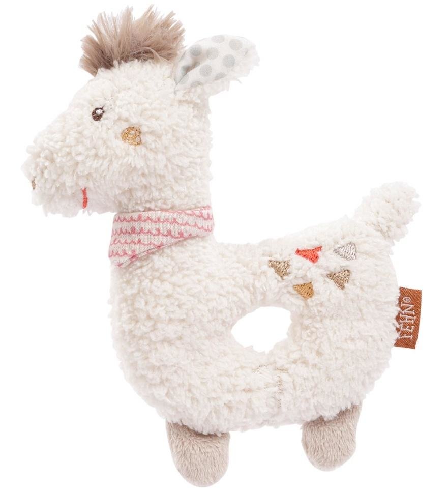 Grzechotka, maskotka, Lama Maya, z kolekcji: Peru. Miękka, urocza grzechotka doskonale pasuje do małych rączek dzieci. Służy do trzymania, chwytania i potrząsania, wydając przy każdym ruchu delikatny dźwięk, co rozwija i pobudza zmysły, oraz doskonali zdolności motoryczne. Aksamitna w dotyku Lama pochodząca z Machu Picchu z peruwiańskich Andów, wprowadza wiele radości i wywołuje uśmiech u każdego dziecka. Rozwija i pobudza zmysły. Doskonali zdolności motoryczne. Można prać. Wszystkie zabawki niemieckiej marki FEHN są bezpieczne dla dzieci od 0 lat. Wykonane są z najlepszej jakości materiałów. Spełniają normy EN71, CE, badane w instytutach "Stiftung Warentest" lub "kotest.