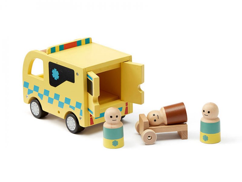 Dřevěná sanitka v krásném designu se dvěma záchranáři a jedním pacientem. Záchranáři mají pro pacienta připravená nosítka, kterými ho převezou do sanitky a naloží pro rychlou jízdu do nemocnice.