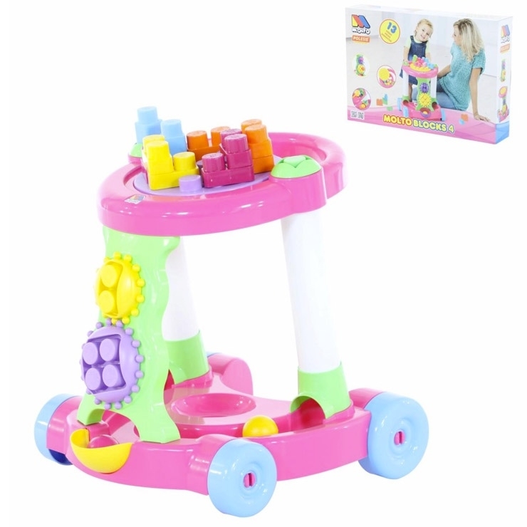 Herní vozík s návrhářem může být použit nejen jako chodec, který se stane spolehlivou oporou pro první kroky dítěte, ale také jako logická hračka, která ho může zaujmout vzrušujícími herními prvky. Zde jsou jasná zařízení, která přispívají k rozvoji jemných pohybových schopností rukou, a návrháře, který zavádí barvu a tvar, a dokonce i mini-labyrint pro plastové koule, které tvoří koncept pohybujících se objektů ve vesmíru. Tento článek může být prezentován v růžové a zelené barvě.