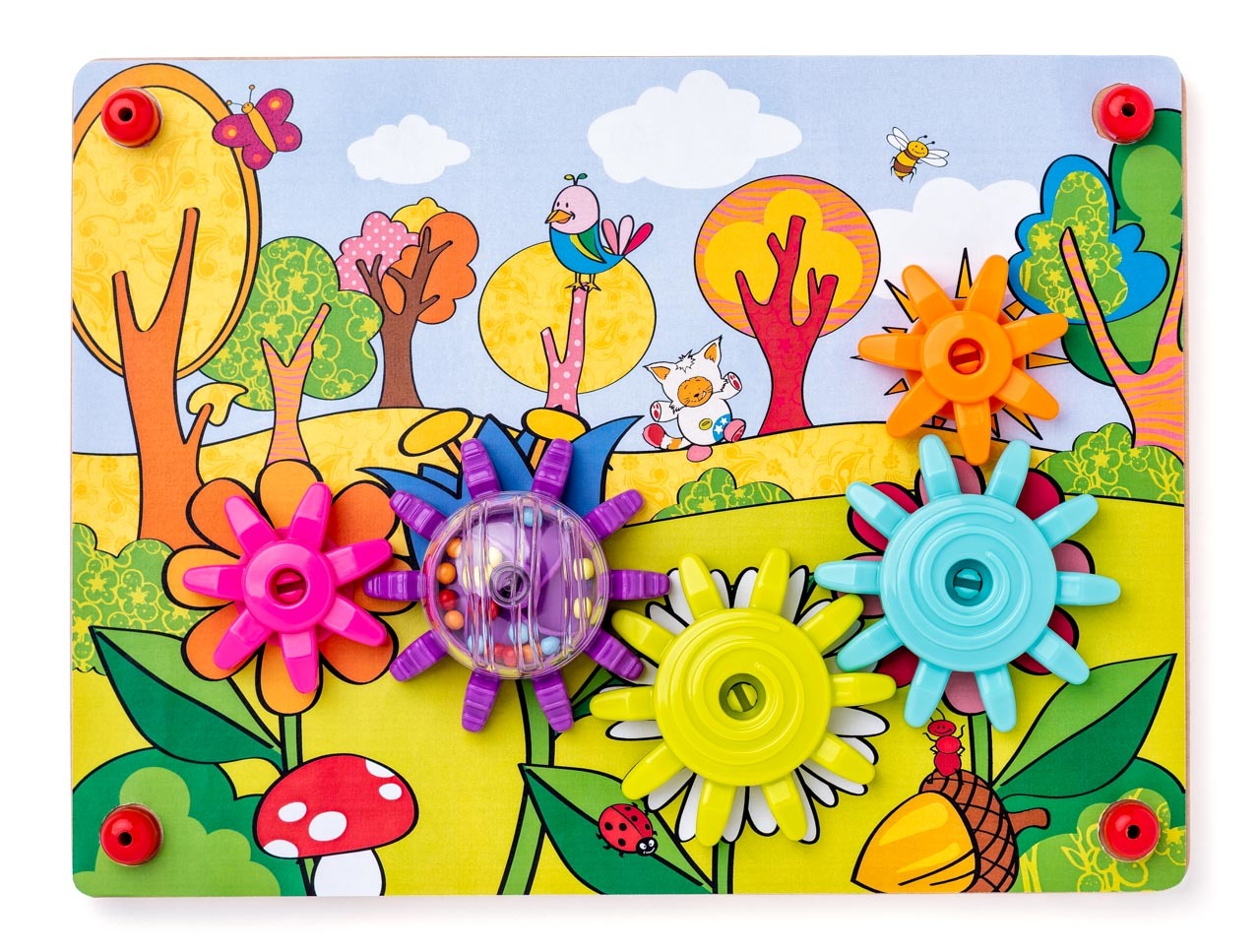 S magickými kolečky ´´Niny´´ se dítě naučí rozlišovat různé velikosti a barvy. Vyberte jeden z šesti nádherných motivů a položte jej na hrací desku. Do připravených otvorů vložte ozubená kolečka tak, aby do sebe zapadala. Roztočením jednoho z koleček uvedete do pohybu i ostatní magická kolečka, která vytvoří barevnou duhu. Hračka pomáhá při tréninku jemné motoriky. Rozměr: 30 x 22,5 cm. Věk: 6m+. Video: https://www.youtube.com/watch?v=BgWcqeISGUI