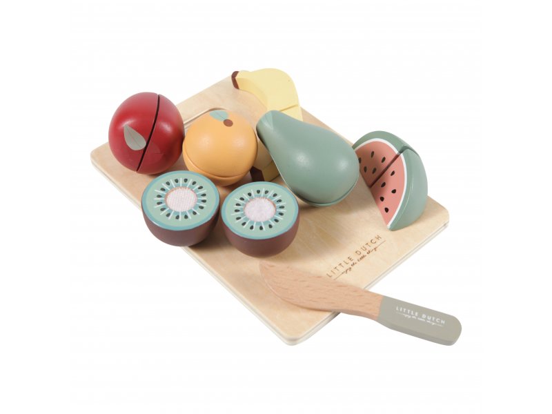 Tato praktická sada obsahuje 6 druhů ovoce - jablko, banán, kiwi, hrušku, pomeranč a meloun. Každý kus lze snadno rozdělit na dvě části a zase spojit díky suchému zipu, což napodobuje skutečné krájení. K sadě navíc patří dřevěný nožík a krájecí prkénko, které dodávají hře na autentičnosti a rozvíjejí schopnosti dětí v bezpečném prostředí.