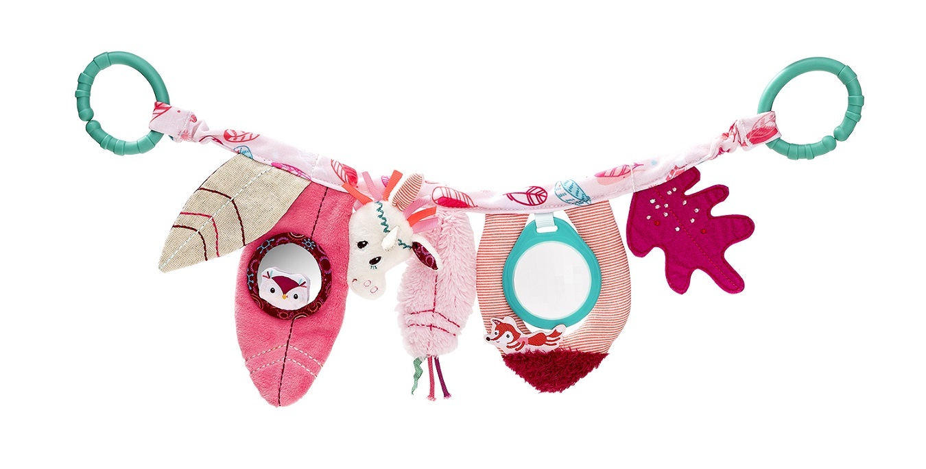 Závěsná hračka pro dívky je vhodná již od 0 měsíců. Upoutá pozornost dětí a zabaví je na cestách. Hračku lze umístit na kočárek, autosedačku nebo postýlku. Hračka rozvíjí zájem dětí o okolní svět a má pro batolata mnoho překvapení - různé materiály, textury, zvuky, zrcátko. Díky plastovým klipům závěsnou hračku snadno připevníte ke kočárku či k autosedačce.