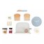 Tento krásně zpracovaný dřevěný toustovač přijde v kompletním balení, které obsahuje vše potřebné pro hravé vaření: dřevěný toastovač, talířek, nůž, dva plátky toastového chleba, máslo, plátek sýra, smažené vejce a dvě skleničky - medu a marmelády. Díky tomu mohou děti hravou formou rozvíjet své motorické schopnosti a učit se o přípravě jednoduchých jídel.