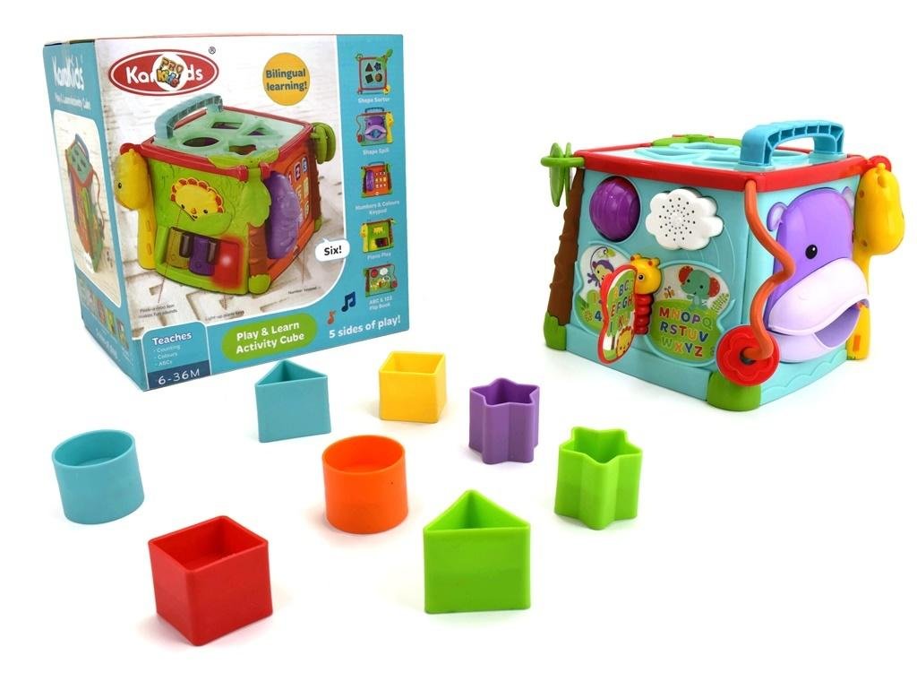 W blokach znajdzie takie zabawy jak sorter, telefon z interaktywnymi przyciskami, interaktywny motylek z literami i liczbami, głowa hipopotama z ruchomymi ustami przez które wypadają klocki, grające pianinko. Każda funkcja pomaga w nauce kształtów, kolorów, literek i cyferek. Kostka posiada ruchome elementy, które wspomagają zdolności manualne. Sorter z klockami ćwiczą rękę i koordynację wzrokowo-ruchową, uczą precyzji i cierpliwości. Funkcje interaktywne tj. pianinko, grzechotka ćwiczą uwagę słuchową, co ma ogromny wpływ na umiejętność świadomego słuchania, a coza tym idzie prawidłowej artykulacji, mowy oraz szybkiej nauki.