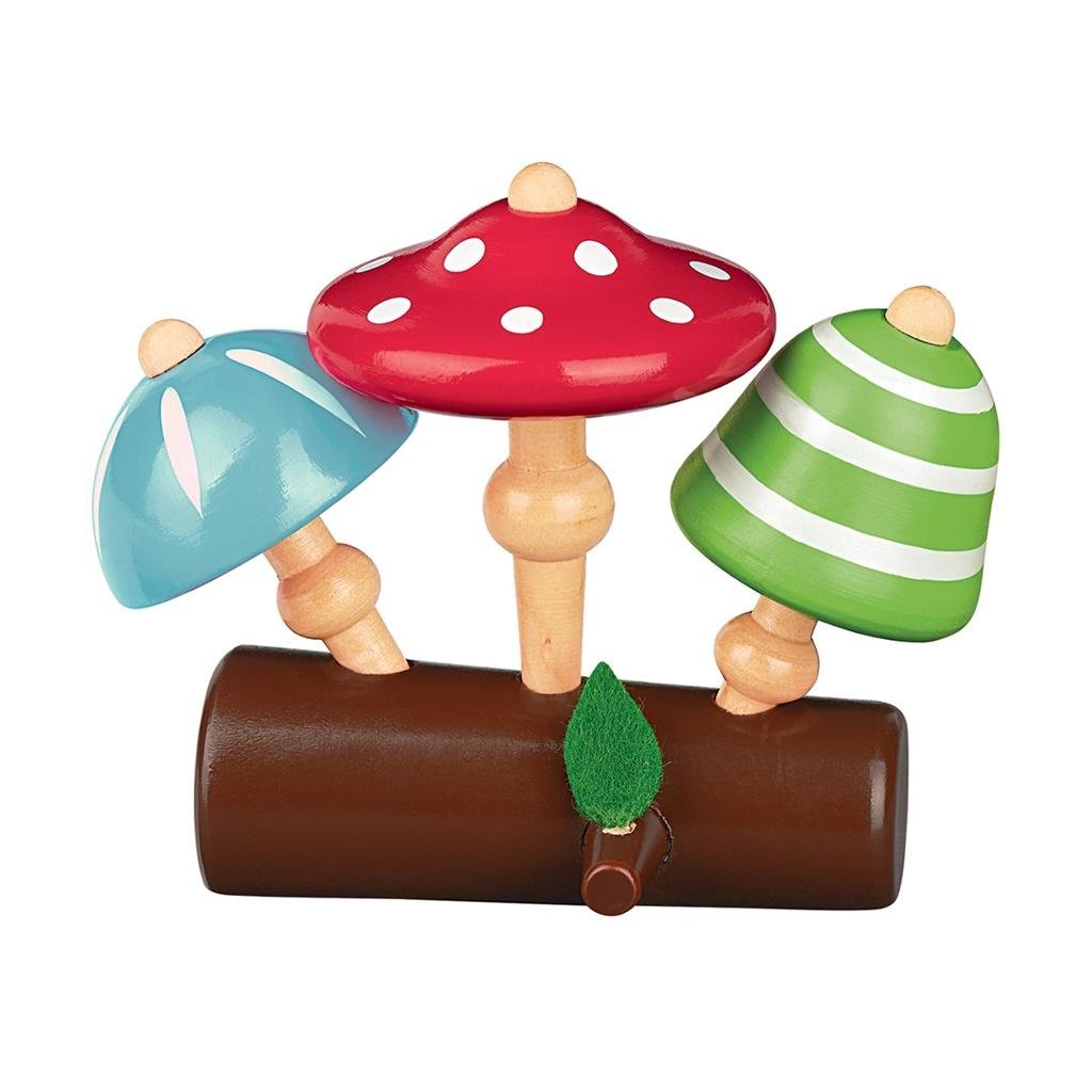 - Zestaw 3 drewnianych baczków w kształcie grzybków na pniu drzewa.