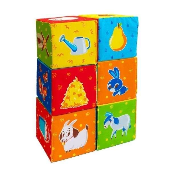 Miękkie kostki z jasnymi, tematycznymi rysunkami wprowadzają dziecko w otaczający go świat.