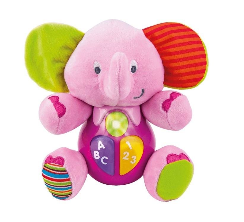 Na brzuszku zwierzątka znajdują się trzy kolorowe przyciski funkcyjne, które uruchamiają różne melodie oraz uczą dzieci podstawowych cyfr i liter. Dodatkowo posiada mięciutką główkę i stópki.