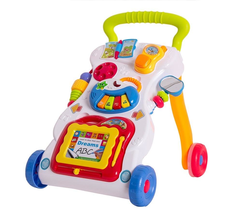Pchacz pomaga przy stawianiu pierwyszch kroków dziecka, ale jest też miejscem do zabawy.