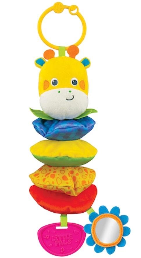 Ma różnorodne bodźce edukacyjne. Uszyta jest z kolorowych miękkich tkanin o rozmaitej fakturze. Maluch dotykając je może sprawić, by poszczególne elementy, zagrzechotały. Gdy pociągnie za wiszący uchwyt z gryzakiem, cała zawieszka zacznie wibrować.