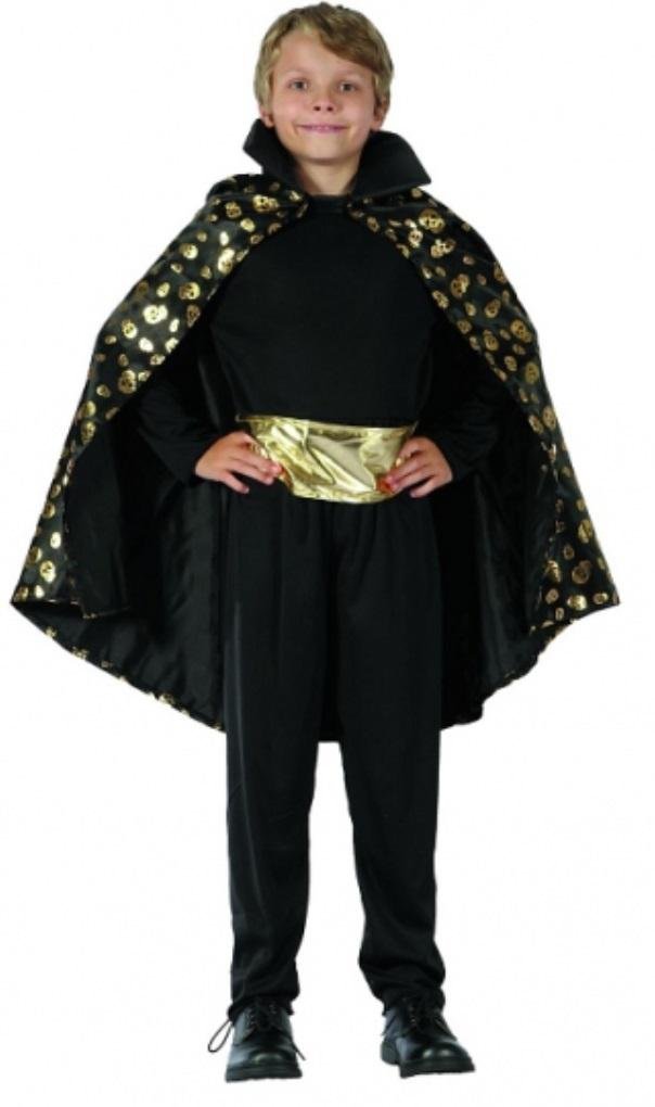 Zestaw zawiera pelerynę oraz pasek. Rozmiar 120/130 cm. Wymiary: dł. cał. peleryny bez kołnierza 69 cm obwód pasa 60 cm Strój małego wampirka został wykonany z wysokiej jakości elastycznego poliestru. Czarna peleryna wykończona złotymi czaszkami, zapinana na rzepy. Sztywny kaptur również w czarnym kolorze. Złoty pas idealnie utrzymuje się na biodrach.