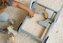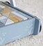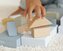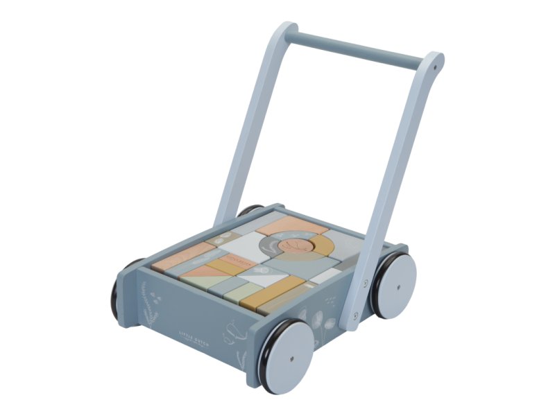 Dřevěný vozíček je vybaven koly s gumovým pruhem a je naplněn barevnými dřevěnými kostkami různých tvarů. Rukojeť je v ideální výšce pro batolata, aby mohly vozíček pěkně tlačit před sebou.
