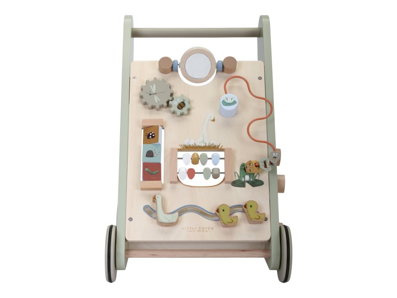 Dřevěné multifunkční chodítko nabízí řadu zajímavých aktivit na podporu rozvoje motoriky vašeho dítěte. Pomozte s vaším dítětem huse a housenkám překonat rybník! Podívejte se, jak se světlo odráží, když otáčíte zrcátkem. Nebo zkuste otočit kolečkem, abyste viděli malé broučky, jak se točí kolem dokola!