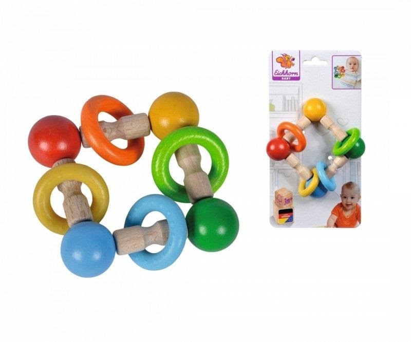 Eichhorn Baby, drewniana zabawka z kółkami: ruchoma zabawka do chwytania wykonana jest z wysokiej jakości drewna bukowego. Można ją łatwo zgiąć. Drewniane i silikonowe pierścienie grzechoczą, podczas potrząsania zabawką. Dzięki różnym kolorom i elastycznym pierścieniom, zabawka poprawia...