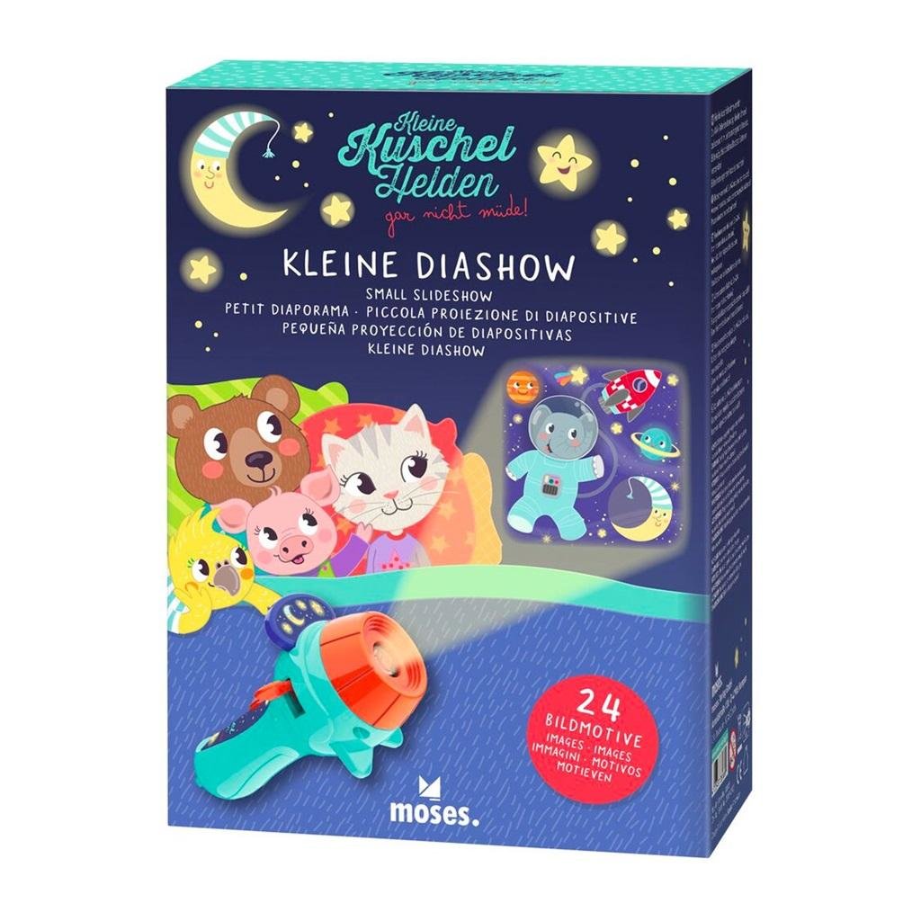 Latarka, Mini Projektor, Słodkie Sny Wspaniały prezent, niezwykły pokaz, który możesz przenieść do pokoju dziecinnego za pomocą latarki - projektora. W tym celu należy włączyć latarkę, wsunąć kółeczko z przeźroczami w szczelinę powstałą po odciągnięciu ruchomej części i skierować na ścianę w zaciemnionym pokoju. Pokaz slajdów z małymi pluszowymi bohaterami zamienia bajkę na dobranoc w interaktywną zabawę! Za pomocą małego projektora można opowiedzieć w sumie trzy historie z ośmioma obrazami: Słodkie Sny, Pory Roku, Czas Spać. Przyglądając się uroczym zwierzakom i słuchając zaczarowanej opowieści, dzieci z pewnością szybko się zmęczą, a ich powieki będą powoli opadać. Niezastąpiony w pokoju dziecięcym, wzbogacenie wieczornego rytuału i wspaniały prezent! Niezwykły pokaz, 3 historie na dobranoc. Wyświetla 24 obrazy (3 kółeczka z 8 przeźroczami). Regulacja ostrości (pokrętło na froncie latarki). Idealna widoczność. Konieczne baterie - 2 szt. AAA. Baterie nie są dołączone do zestawu. Wymiary projektora: 14 cm x 4 cm x 4 cm. Wymiary opakowania: 14 cm x 19 cm x 6,5 cm. Kategoria wiekowa: 3+. UWAGA! Przeznaczony dla dzieci powyżej lat 3. UWAGA! Nigdy nie świecić bezpośrednio w oczy. Produkty Moses są projektowane w Niemczech, ze szczególną dbałością o zrównoważony rozwój dziecka i wykonane z wysokiej jakości materiałów. Zabawki są wytwarzane zgodnie z filozofią "nauka przez zabawę", aktywnie wspierają i stymulują zarówno wyobraźnię jak i edukację dziecka.