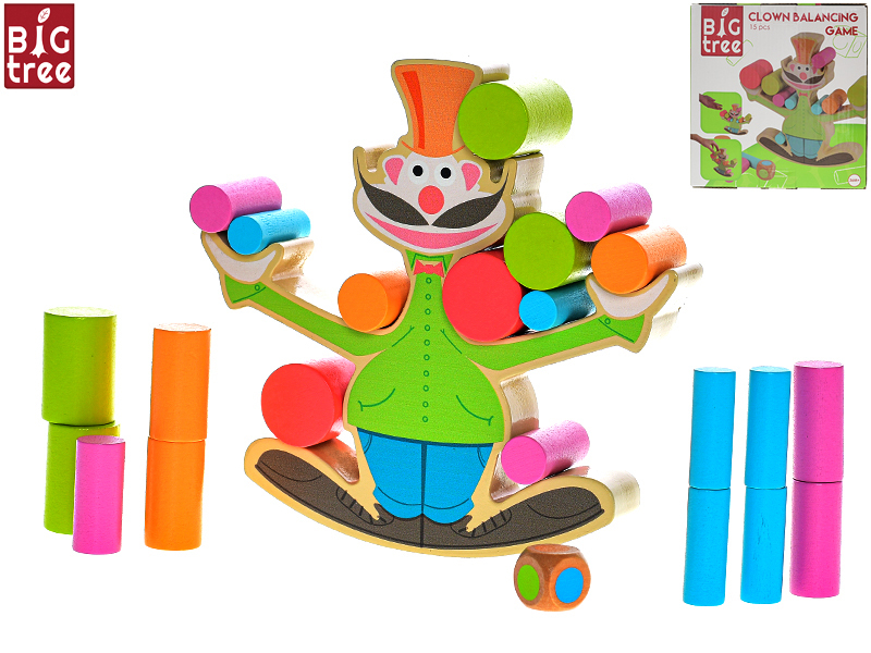 Big Tree balanční hra dřevěná klaun 18x19cm s 22ks dřevěných válečků v krabičce