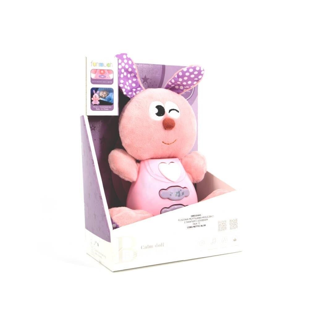 Króliczek posiada funkcję światłą oraz dźwięku. Muzyczka pozwoli uspokoić maluszka i pomóc w zaśnięciu. Wymagane jest użycie baterii 2 x 1,5V AA. Pluszowy króliczek przeznaczony jest dla maluszków od narodzin.