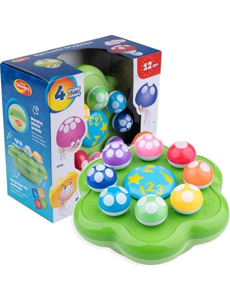 Kwiatek na kołyszącej podstawie zabawi na 4 różne sposoby! Zabawka posiada 4 tryby działania: cyfry, muzyka, kolory i gry. Aby wybrać konkretny tryb należy nacisnąć na niebieskie kółko, znajdujące się na środku zabawki. W trybie cyfry, zadaniem malucha będzie liczenie kropek, znajdujących się na kolorowych grzybkach, w trybie kolory, poznawanie nazw kolorów widocznych na grzybkowych kapeluszach, w trybie muzyka, grzybki w magiczny sposób przekształcą się w klawisze pianinka, aby maluch mógł zagrać na nich prawdziwy koncert, a w trybie gra, zabawka będzie zadawać pytania dotyczące liczenia i określania kolorów. Zabawka wyposażona jest w regulację głośności oraz wyłącznik.
