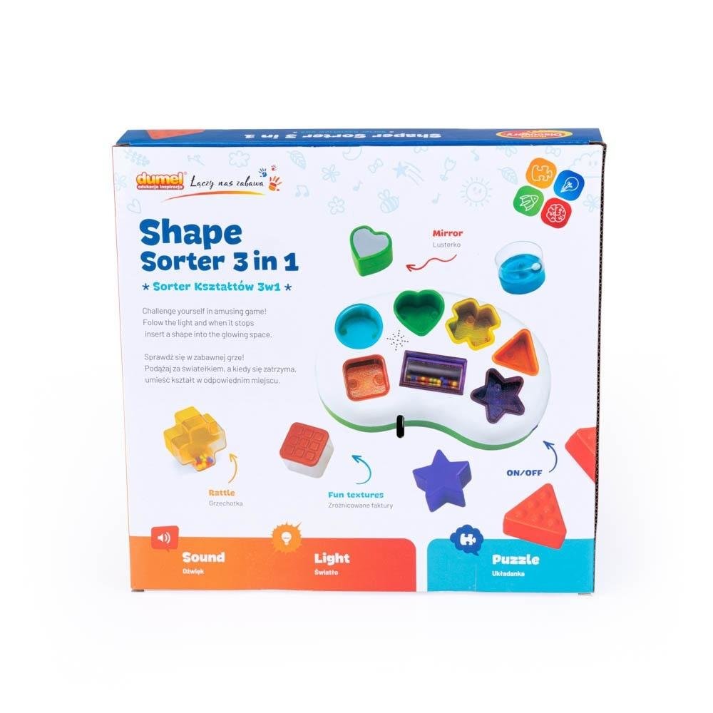 Ćwicz spostrzegawczość z sorterem wypełnionym po brzegi dźwiękiem i światełkami! Zabawka posiada 3 tryby działania. W pierwszym z nich, za każdym razem, gdy dziecko umieści klocek w odpowiadającym mu otworze, usłyszy zabawny dźwięk. W drugim trybie, po umieszczeniu klocka we właściwym miejscu, maluch zostanie nagrodzony wesołą melodią. W trzecim trybie na dzieci czeka gra w polowanie na światełko! Kiedy zatrzyma się ono w jakimś miejscu, należy umieścić w tym otworze odpowiedni klocek. Poszczególne klocki z zestawu różnią się nie tylko kształtem, ale też kolorem. Dwa z nich posiadają wypustki, trzy grzechoczą, a serduszko skrywa na odwrocie bezpieczne lusterko. W zabawce znajduje się także grzechoczący, obrotowy element. Wszystko to, aby w pełni zaangażować bobasa do zabawy dźwiękiem, światłem i kolorem!