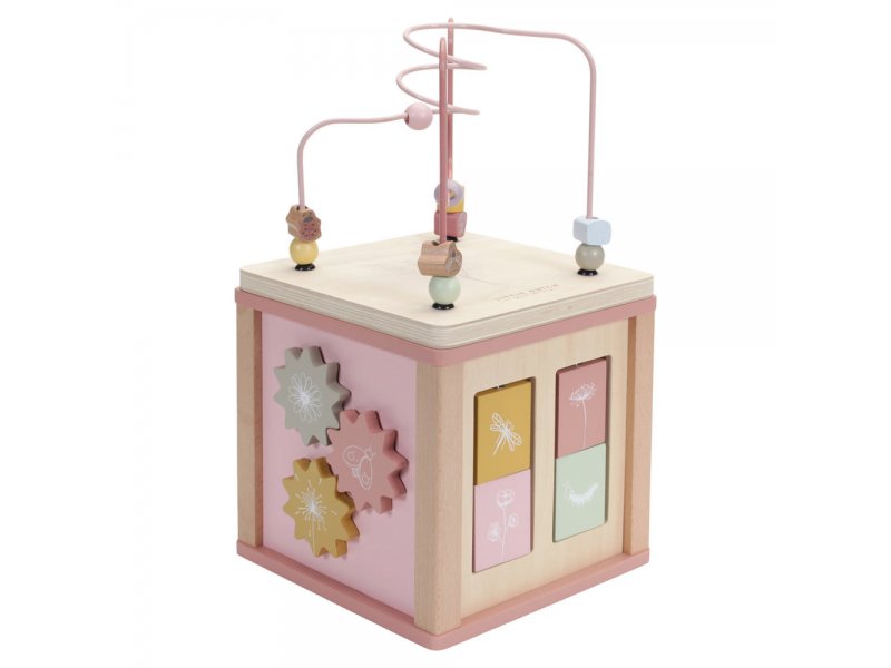 Krásná dřevěná kostka s aktivitami vzbuzuje u dětí zvědavost a poskytuje jim spoustu zábavy. Jednotlivé strany kostky obsahují nabízí různorodé aktivity - např. třídění tvarů, rotující převody, hádanky či spirály s posuvnými korálky.
