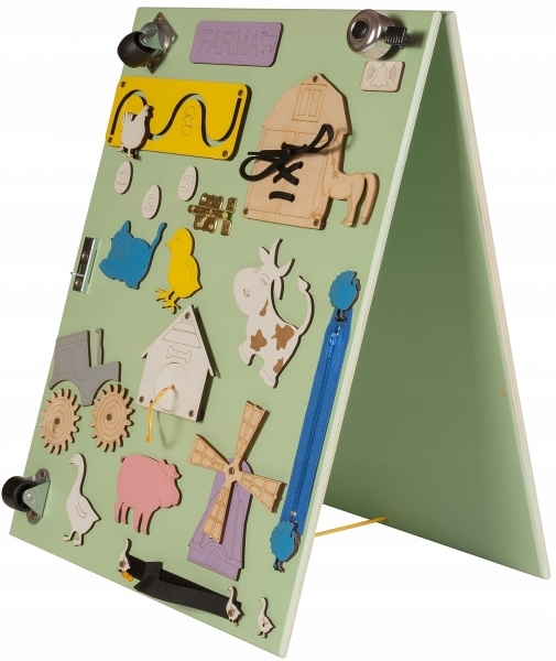 Dětská oboustranná edukační tabulka patří mezi montessori hračky, kde se děti přirozenou cestou pomocí hry vzdělávají, rozvíjejí dovednosti, tvořivost, kreativitu, logické myšlení, trpělivost a jemnou motoriku. Pomocí hry se budou u vašeho dítěte přirozenou cestou rozvíjet schopnosti a zdokonalovat jeho dovednosti. Děti ocení ozubená kola, zip, zvonek, tkanička, číslice, labyrint, kolečka, zvířata známa z venkovu atd. Součástí výrobku jsou barevné křídy na druhou křídovou stranu tabule.