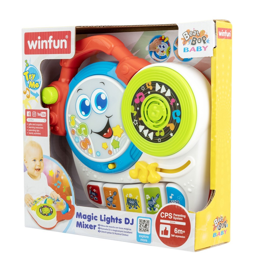 Interaktivní DJ mixážní pult pro nejmenší se spoustou zvuků a tónů. Pult má 2 módy: samostatné tóny nebo hraní s melodií. Nabízí 5 tlačítek se zvuky hudebních nástrojů, DJ podložka, blikající magická podložka na bicí. Mezi hmatové aktivity patří posuvná nota a otočné tlačítko. Snadno uchopitelná rukojeť pro přenášení. Hračka vyžaduje 3 AAA baterie, jsou součástí.