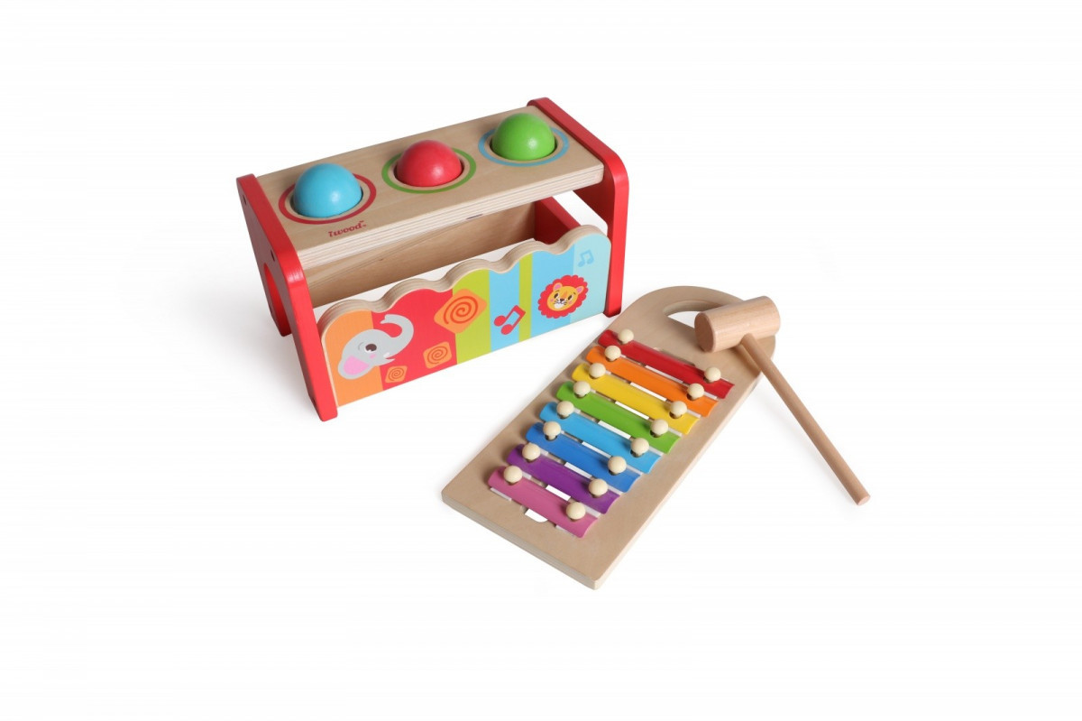 Wyjątkowa drewniana przebijanka z cymbałkami dla każdego maluchaŚliczna drewniana przebijanka z młoteczkiem i cymbałkami wykonana z drewna przyniesie każdej małej dziewczynce lub chłopcu wiele radości. Stuk-Puk! Wystarczy przebić kulę na drugą stronę, aby zobaczyć jak wesoło wypada drugą stroną, aby następnie zaobserwować jak ta toczy się po cymbałkach, wydając przy tym interesujące dźwięki. Drewniana przebijanka z cymbałkami jest nie tylko źródłem świetnej zabawy, ale pomaga też przy rozwoju wzrokowo-ruchowym i ćwiczy celność. Cymbałki można wyjąć i używać osobno, co pozwoli dziecku na ćwiczenie umiejętności rozpoznawania dźwięków oraz rozwinie jego kreatywność. Używanie młoteczka pomaga przy ćwiczeniach zdolności manualnych, które są niezwykle ważne w czasie dojrzewania dziecka powyżej pierwszego roku życia. Dopracowana w każdym caluDrewniana przebijanka z cymbałkami została wyprodukowana z bardzo trwałego drewna, dzięki czemu będzie służyć przez lata. Atrakcyjna kolorystyka zabawki, nie tylko wpływa na wrażenia estetyczne, ale jest też niezwykle ważna dla rozwoju dziecka. Połączenie czerwonego, niebieskiego i zielonego doskonale wpłynie na wrażliwy wzrok malucha, pozwalając mu przystosować spojrzenie do różnych odcieni, pobudzając przy tym wyobraźnię, a piękne zwierzątka, którymi ozdobiono zabawkę dodatkowo zainteresują dziecko. Drewnianą przebijankę z cymbałkami pokryto pięknymi kolorami, do których użyto nietoksycznych farb, dzięki czemu są bezpieczne nawet dla maluchów, które mają tendencję do wkładania przedmiotów do buzi. Zabawka będzie doskonałym prezentem.Wszystkie elementy drewnianej przebijanki z cymbałkami zostały specjalnie skrojone pod małe rączki dziecka, co ułatwia łapanie ich i zapobiega wysuwaniu się z uchwytu dłoni. Zalety produktu