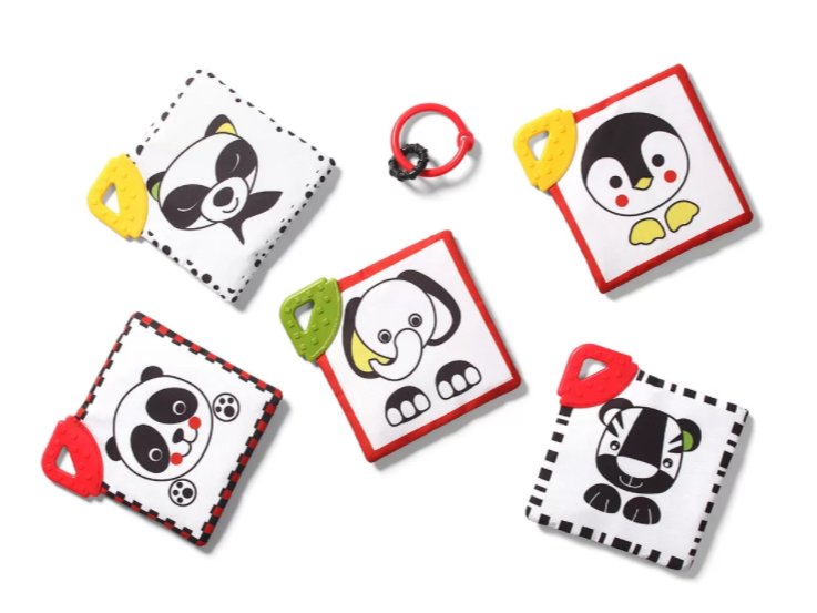 - Podpora vizuálního vnímání díky výrazným červeným a černým kontrastům, které novorozenci nejlépe rozpoznávají.