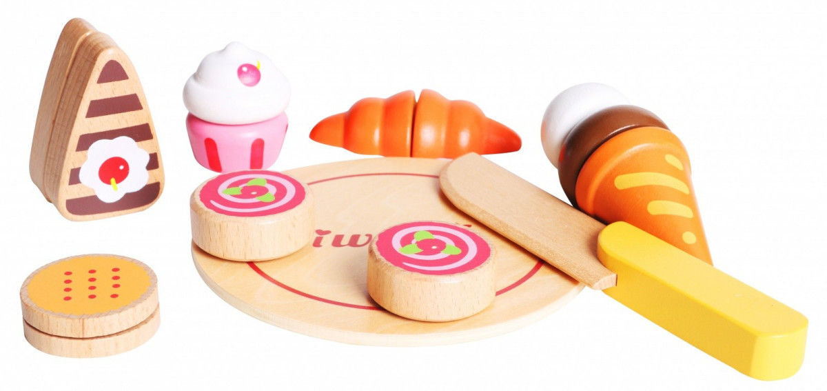 Apetyczne słodycze idealne na podwieczorek w towarzystwie przyjaciół! użyj zabawkowego noża do przekrojenia ciasta. Elementy słodyczy są mocowane na rzepy i można je rozdzielać, co zwiększa realizm. W zestawie zabawny nożyk, talerzyk, zabawkowe ciasta, babeczki i lody. Całość wykonana z drewna malowanego bezpiecznymi, nietoksycznymi farbami wodnymi całkowicie nieszkodliwymi jeżeli mały kucharz postanowi nadgryźć swoje dzieło. Zabawka wspaniale rozwijają wyobraźnię dziecka pozwalając mu na uwielbiane przez maluchy odgrywanie ról i ćwiczenie umiejętności przydatnych w całym życiu. Zabawa w grupie przyjaciół pozwala kształtować umiejętności społeczne i umacnia więzy rodzinne.Dzieci poznają świat poprzez konkretne elementy otoczenia z którymi się spotykają. Każdy produkt marki iWood został starannie zaprojektowany, aby zagwarantować bezpieczeństwo a jednocześnie pozostać atrakcyjnym i absorbować uwagę dziecka. Każda zabawka ma na celu pomóc maluchowi rozwijać inteligencję, zdolności manualne, ćwiczyć ruchy precyzyjne, koordynację oko-ręka i widzenie przestrzenne. Każda zabawka marki iWood rozwija kreatywność, umiejętność opowiadania historii i ułatwia dziecku zrozumienie otaczającego je świata. Zabawa w grupie rozwija bardzo ważne zdolności społeczne i umacnia więzy rodzinne. Zabawki iWood wykonane są z naturalnych w pełni odnawialnych materiałów. Ścisła kontrola jakości na każdym etapie produkcyjnym zapewnia bezpieczeństwo i wysoką jakość.