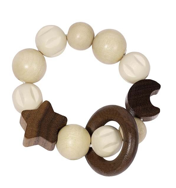 Dřevěné chrastítko Měsíc a hvězda je ideální volbou pro vaše nejmenší, kteří právě objevují svět kolem sebe. Jeho originální tvary a krásné kontrastní barvy přirozeného ořechového a javorového dřeva skvěle upoutají pozornost dítěte a podpoří jeho smyslový a motorický vývoj.