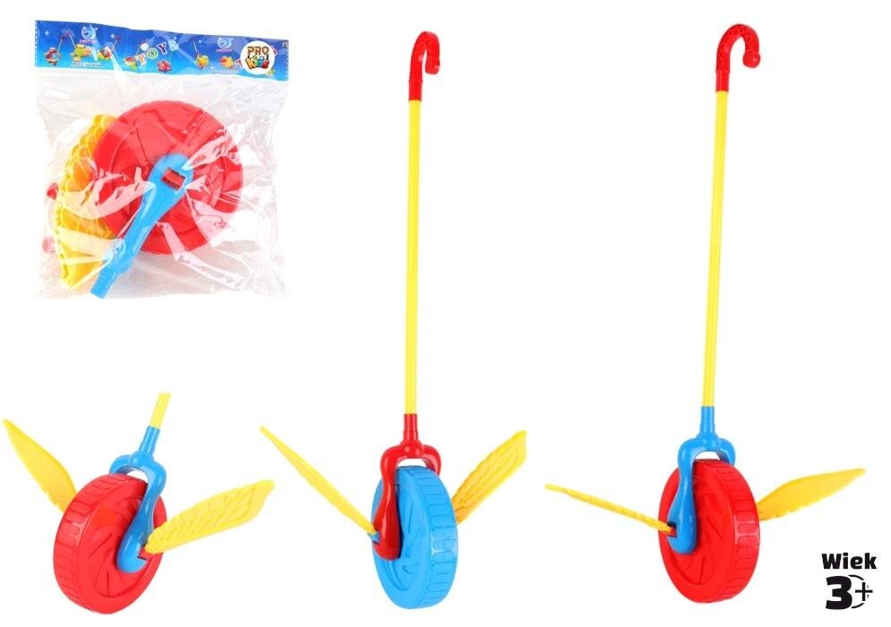 Prosty w obsłudze: Wystarczy pchać zabawkę, aby koło z kolorowymi skrzydełkami się kręciło.