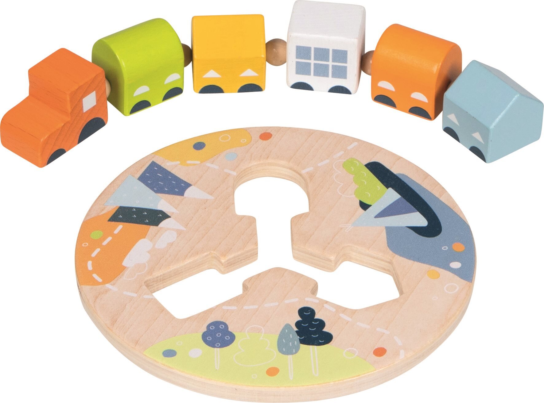 Provlékací vláček s pěti vagónky je velmi důmyslná dovednostní hra vyrobená ze dřeva. Lokomotiva s pěti různě tvarovanými vagónky projíždí krajinou. Dostane se dále, jen pokud jsou vagónky umístěny do správného otvoru. Procvičuje jemnou motoriku, vnímání tvarů a prostorové myšlení. Balení obsahuje: dřevěný vláček s pěti vagónky, dřevěnou provlékací základnu. GOKI patří mezi nejvýznamnější evropské výrobce hraček s vysokou pedagogickou a didaktickou kvalitou. Firma klade důraz na bezpečnost hraček, jejich zdravotní nezávadnost a dbá na obnovitelné zdroje. Dřevo je bráno tam, kde může dorůstat. Používané dřeviny jsou javor, buk, ořech, lípa, jasan, borovice, bříza a gumovník. Barvy a laky pocházejí od menších výrobců.