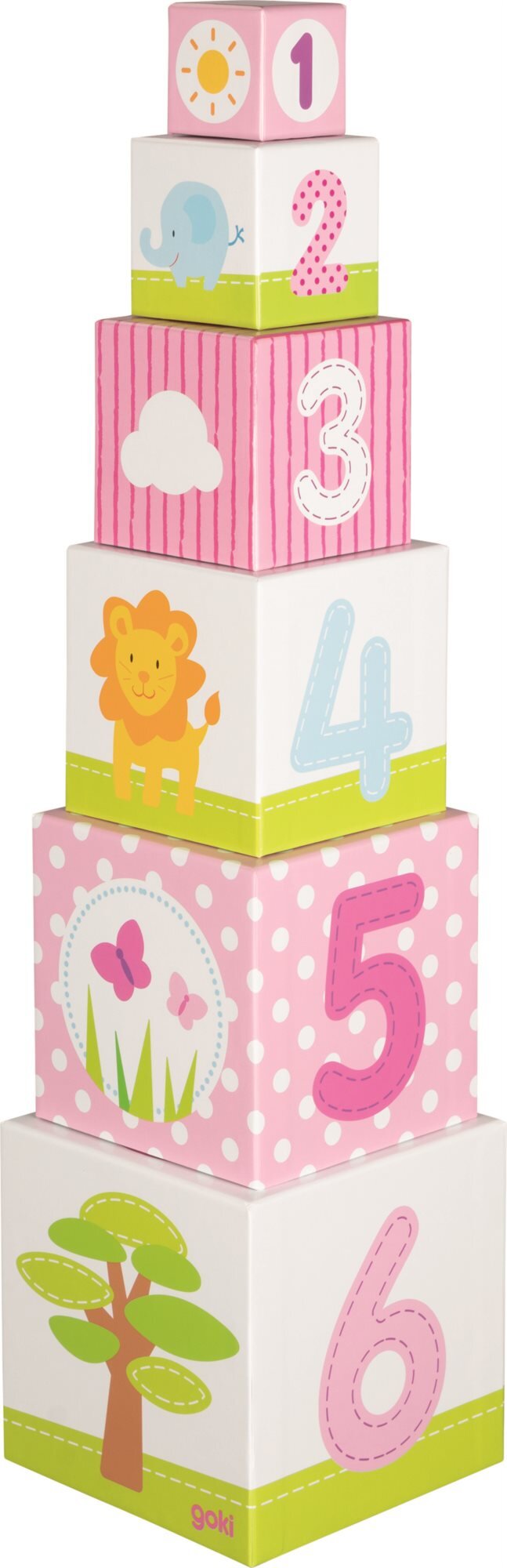 Přestože působí velmi jemně, je tento komín postaven z pevných kostek s hvězdičkami, zvířátky, čísly a rostlinami. Obsah balení: 6 kostek z pevného kartonu. Velikost největší kostky 14,3 x 14,3 x 14,3 cm. Celková výška po sestavení: 57,5 cm. Vhodné pro děti od 12 měsíců. GOKI patří mezi nejvýznamnější evropské výrobce hraček s vysokou pedagogickou a didaktickou kvalitou. Firma klade důraz na bezpečnost hraček, jejich zdravotní nezávadnost a dbá na obnovitelné zdroje. Dřevo je bráno tam, kde může dorůstat. Používané dřeviny jsou javor, buk, ořech, lípa, jasan, borovice, bříza a gumovník. Barvy a laky pocházejí od menších výrobců.