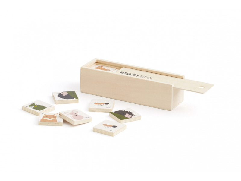 Klasické pexeso v krásném dřevěném provedení s motivy zvířat patří do série hraček Edvin, inspirované skandinávskou přírodou. Jednotlivá zvířata mají svá jména a dítě se tak během hry může učit i písmenka: Ola - růžová sova, Sus - zelená sova, Tor - myš, Bo - los, Max - medvěd, Stella - ježek, My - mravenec, Ed - liška, Tyra - sob a Lo - rys ostrovid.