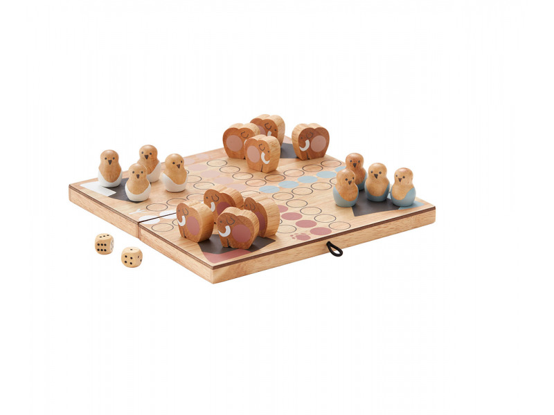 Klasická hra "Člověče, nezlob se!" v orignálním dřevěném provedení s figurkami v podobě zvířat z doby kamenné.
