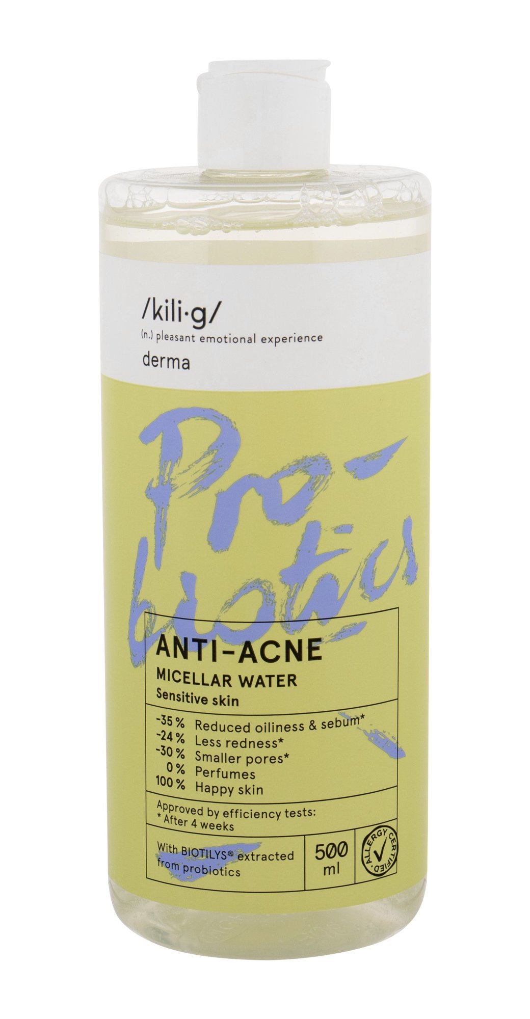 Micelární voda pro mastnou citlivou pleť **/kili·g/ derma micellar water anti-acne sensitive skin** Micerální voda účinně čistí z pleti nečistoty a zbytky make-upu. Přípravek díky 100% přírodnímu komplexu BIOTILYS®, bohatého na probiotika, obnovuje porušenou kožní bariéru, zjemňuje a zklidňuje citlivou pleť. Micelární voda regeneruje strukturu pleti a dodává jí zdravý vzhled. Dvojdraselná sůl a betain zklidňuje podráždění. Komplex SOPHOLIANCE S® zabraňuje množení bakterií způsobujících akné. S micelární vodou derma micellar water anti-acne sensitive skin bude Vaše pleť čistá a zklidněná. **Účinky:** · hydratace pleti · zklidnění podráždění · obnova porušené kožní bariéry · prevence proti akné **Aplikace:** Aplikujte přípravek na vatový tampon. Jemnými tahy stáhněte nečistoty z pleti.