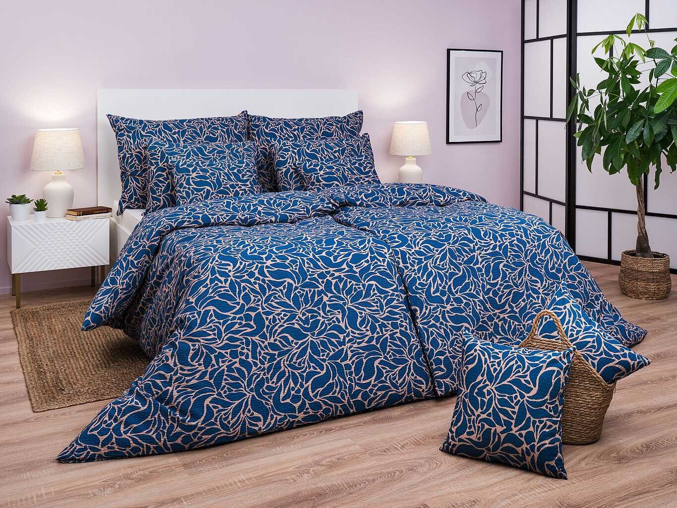 Elegantní krepové povlečení Sorat tmavě modrý s decentním vzorem v tmavě modré barvě je ideální volbou pro každého, kdo ocení pohodlí bez nutnosti žehlení. Skvěle ladí s prostěradlem v barvě medová nebo banán. Vyrobeno v České republice firmou DADKA VRACOV.